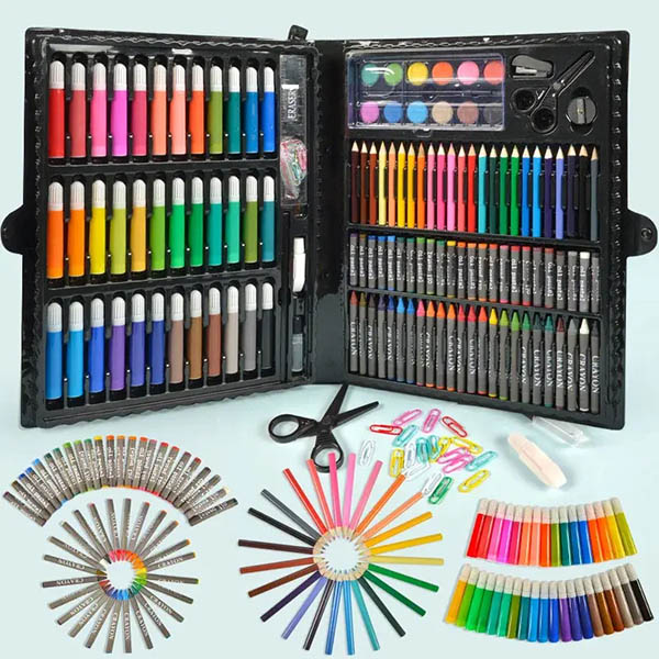 Включва моливи, линия, пастели, акварели и острилка — идеално за училищни проекти, часове по рисуване или забавление в свободното време.
