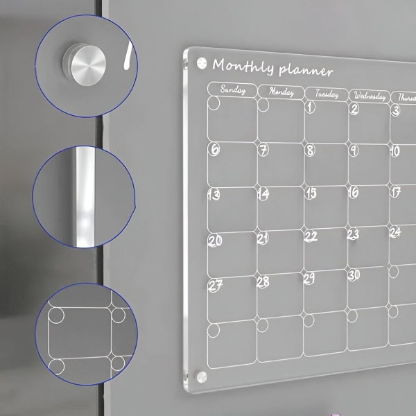 Комплект акрилни календари за хладилник – Месечен + седмичен планер (всеки 40 x 30 см), 4 магнита, сухо изтриване, включени маркери | REUSABLEPLAN