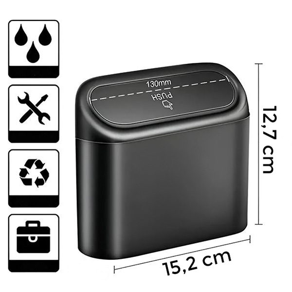 CLEANMOBIL е изработено от здрава, водоустойчива пластмаса за максимална здравина и дълготрайност. Дизайнът с капак за натискане улеснява изхвърлянето на боклука, като същевременно запечатва миризмите, за да запази колата ви свежа и чиста.