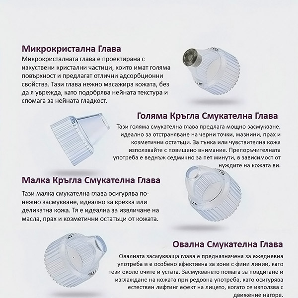 Устройството се предлага с 4 сменяеми приставки, всяка от които е предназначена за справяне с конкретни проблеми на кожата. Вижте графиката по-долу за повече подробности за това как работи всяка приставка!