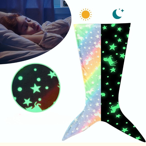 Одеялото MERMAIDREAM свети в тъмното, осигурявайки успокояваща светлина, за да облекчи нощните страхове. Просто го изложете на дневна светлина за 20 минути и то ще свети меко през цялата нощ. Изберете дизайн с опашка на акула или опашка на русалка за допълнителна магия, докато детето ви спи.