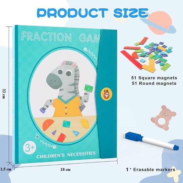 Включва 9 цветни магнитни кръга и правоъгълника, които улесняват визуализирането и разбирането на дробите.